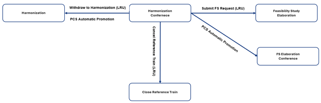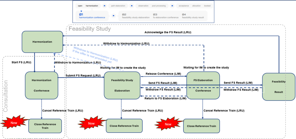 - If the New Path Request deadline has passed and the reference train is still in the Harmonization Conference phase, then the process type is converted from New Path Request to Late Path Request (Process conversion, Promotion_36)